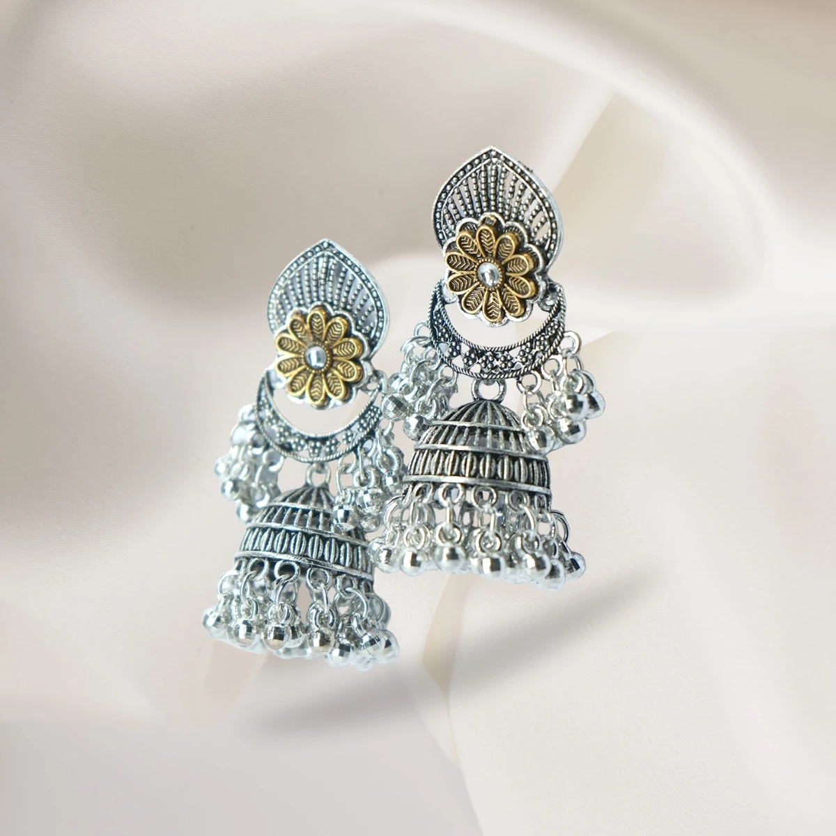 Bring a touch of vintage charm to your look with these Dual Tone Oxidised Jhumka Earrings in Silver and Copper.