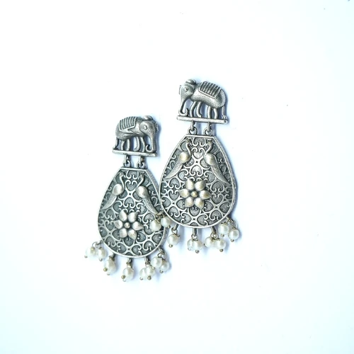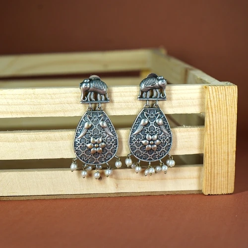 Bring a touch of charm and tradition to your look with this Oxidised Silver Replica Elephant Earring Set.