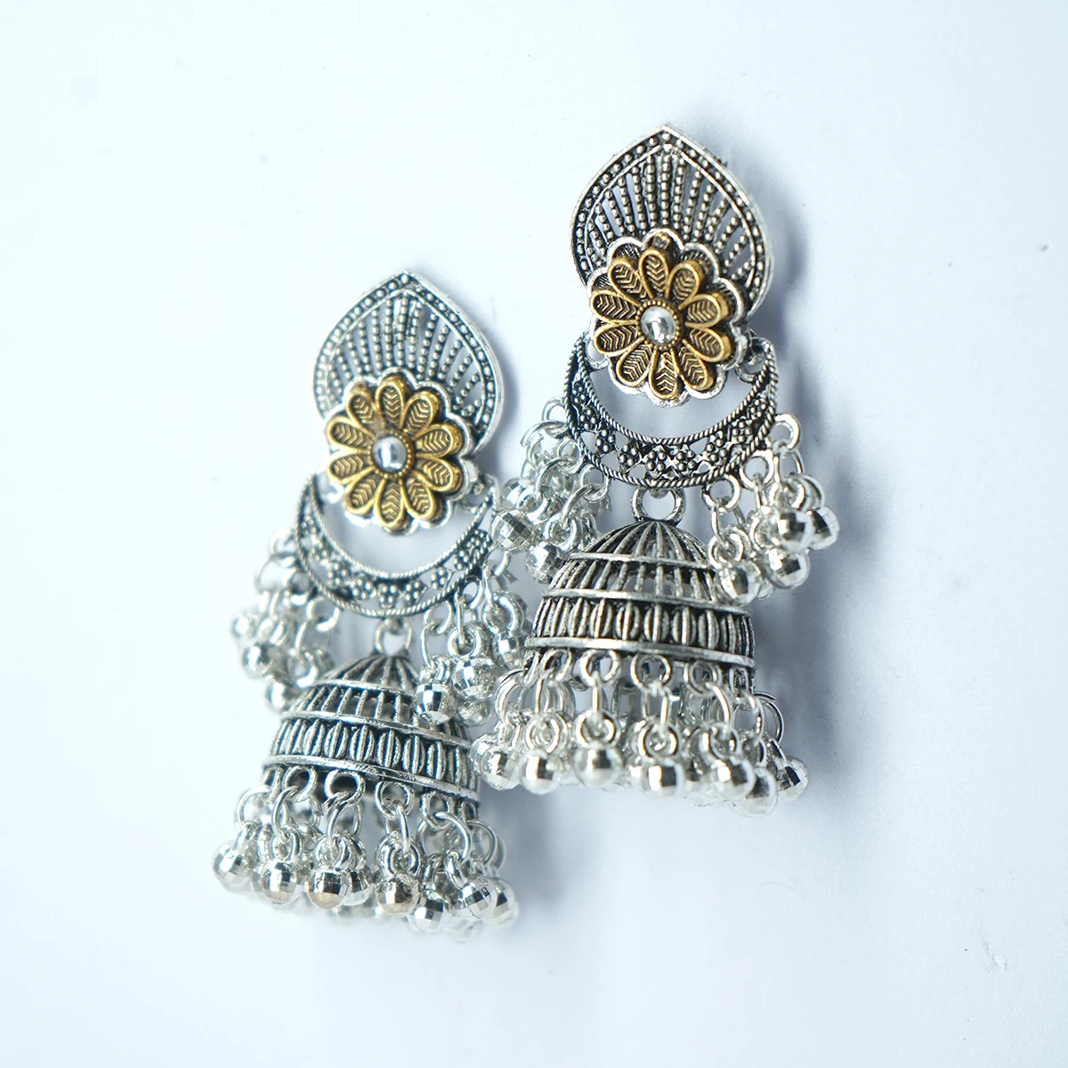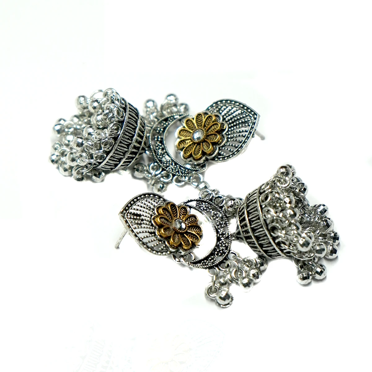 Bring a touch of vintage charm to your look with these Dual Tone Oxidised Jhumka Earrings in Silver and Copper.